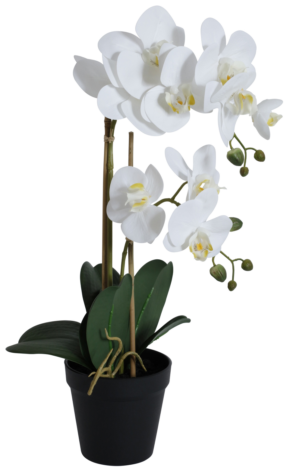 Ett konstväxt av högsta kvalite som både känns och ser verklig ut. Orkidè 2 stänglad komplett i en svart kruka av plast. Totalhöjd 54 cm hög.