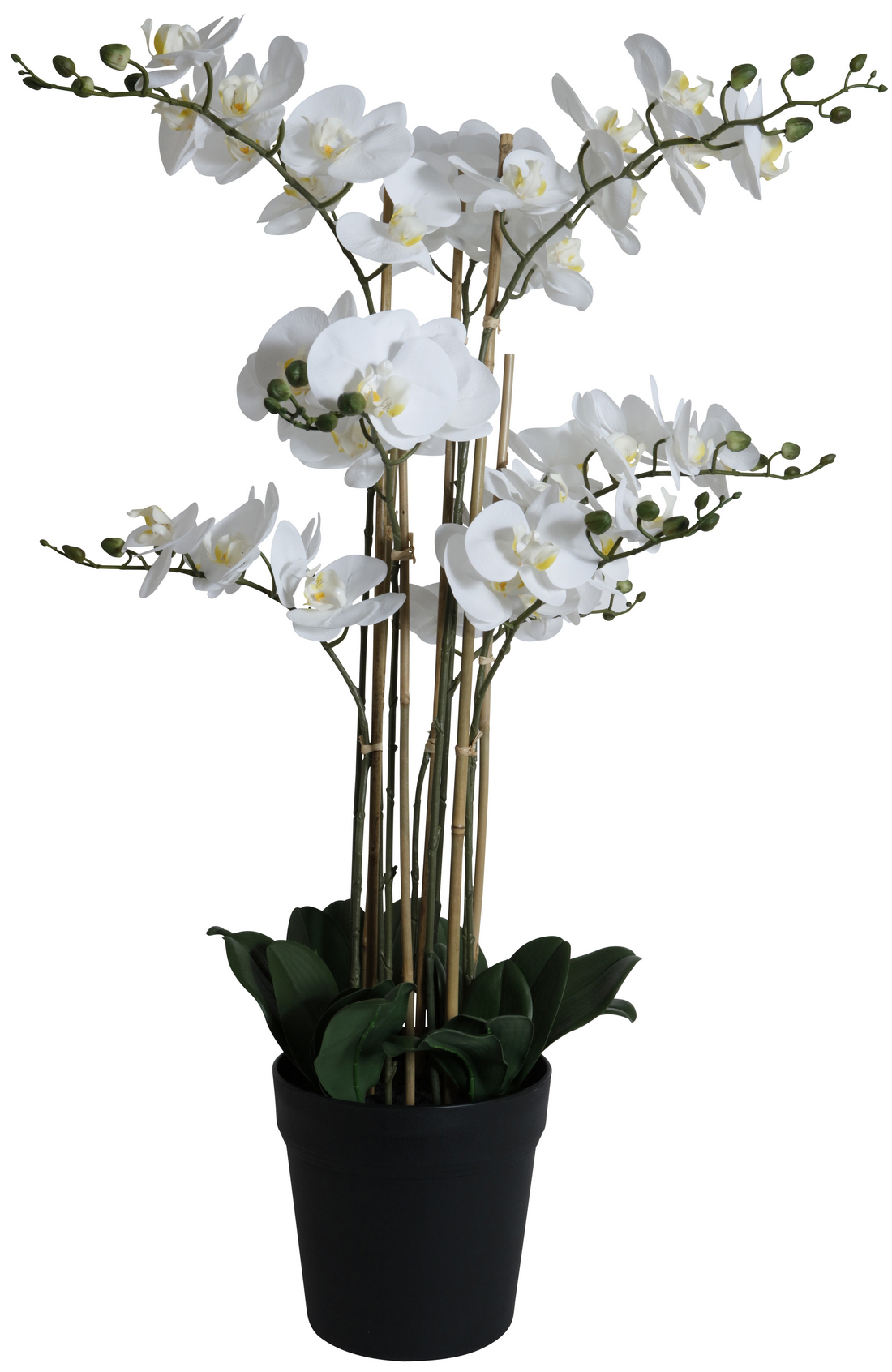 Ett konstväxt av högsta kvalite som både känns och ser verklig ut. Orkidè 9 stänglad komplett i en svart kruka av plast. Totalhöjd 90 cm hög.