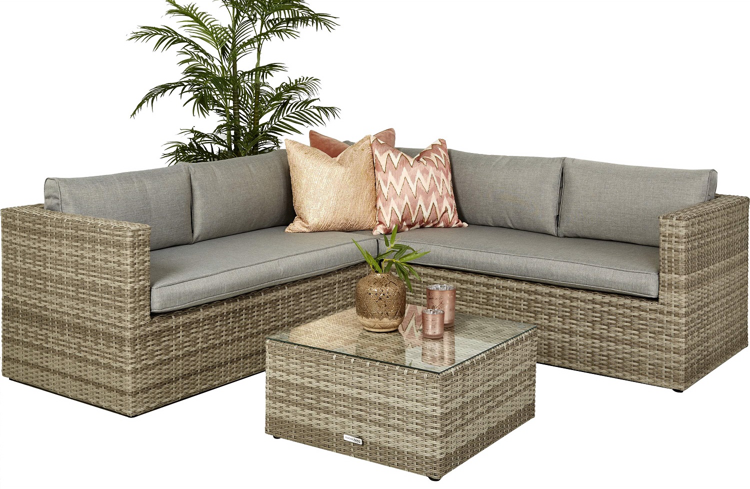 En mysig soffgrupp för utomhusbruk i en modern design. Tillverkad i konstrotting och bordet har en toppskiva av klarglas. Gruppen passar perfekt till uteplatsen och är det lilla extra som behövs för att maxa mysfaktorn.