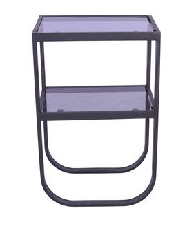 Korsbacken är en serie möbler med metallstomme och toppskivor/hyllplan av färgat glas. Denna variant har en svart stomme.