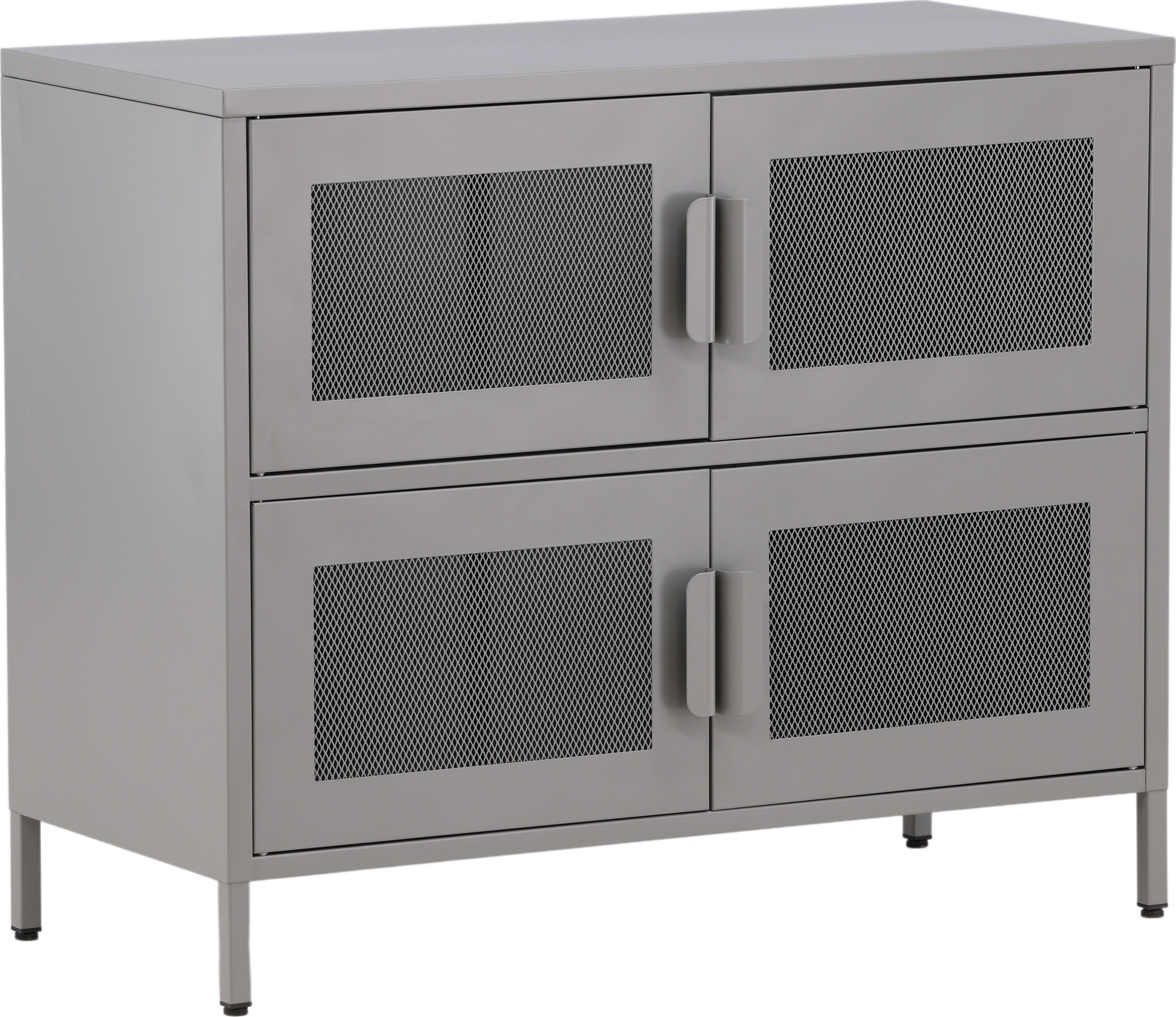 Möblera hemmet smart och snyggt med ett praktiskt förvaringsskåp från serien Krado i läcker industriell design. Det här skåpet är tillverkat i grått stål med nätluckor som blir en smakfull detalj för ögat. Skåpet har två hyllplan med fyra luckor som skapar massvis med plats för semi-dold förvaring. Skåpets djup ger ett robust intryck och passar utmärkt för avlastning även på toppskivan - pryd med dekorationer och skapa ett blickfång som imponerar. De smala, höga benen som lyfter upp skåpet skapar en luftig känsla och underlättar även för dammsugaren. Njut av en smart möbel.
