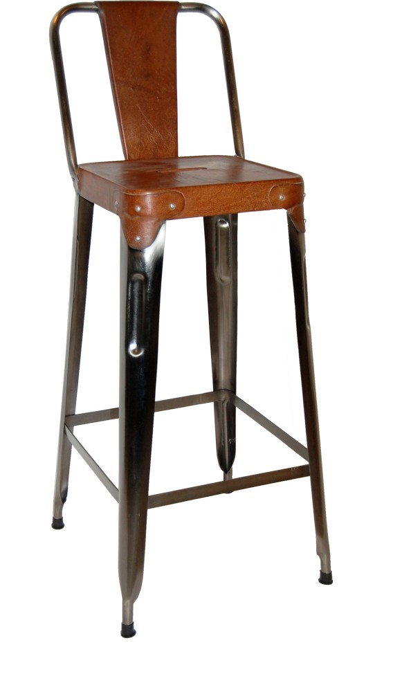 Barstol i raka linjer av vintage metall och läder, robust och smidig i sin design.