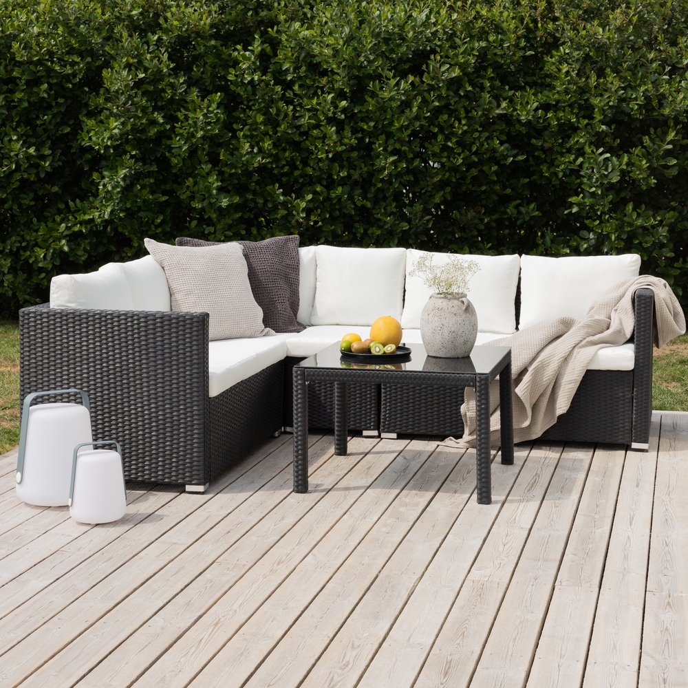 Kuba, en modern loungegrupp i svart konstrotting av hög kvalité som garanterat kommer göra succé till uteplatsen eller altanen i sommar. Loungegruppen består av en hörnsoffa som är i modulform, så det går att kombinera den på flera olika sätt, här med 4 sittplatser och ett hörn. Inklusive vita mjuka dynor samt ett rektangulärt soffbord med en bordsskiva i svart glas. Mått: 180x180 cm. Lättare montering krävs. Här kan du och dina gäster sitta bekvämt och njuta av sena sommarkvällar! Skötselråd: Konstrotting är ett plastmaterial som passar alldeles utmärkt för vårt skandinaviska klimat. Materialet är UV-beständigt och tåler väder och vind. Att det är UV-beständigt gör att möblerna inte bleknas, däremot rekommenderar vi alltid att förvara möblerna under ett möbelskydd eller på annat vis torrt och svalt - för att förlänga livslängden.