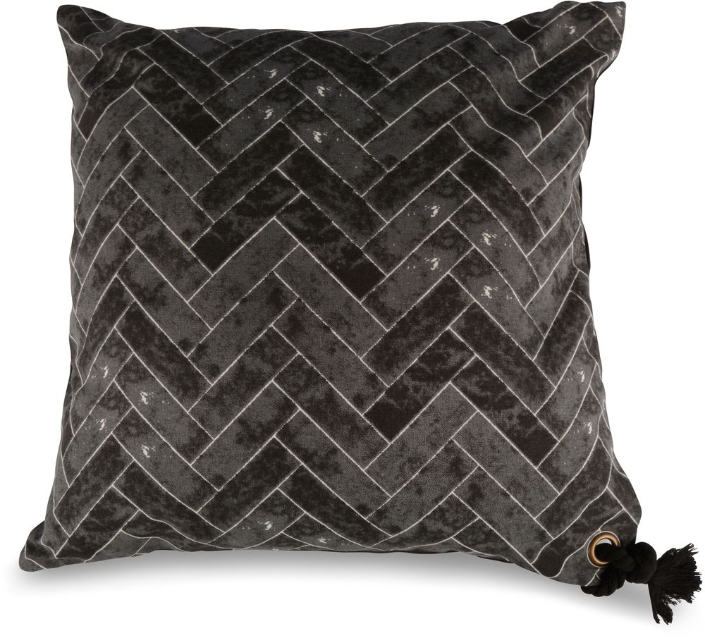 En mysig och snygg kudde i svart mönstrad textil och stoppad med bomull. En fin dekorativ knut i ena hörnan.