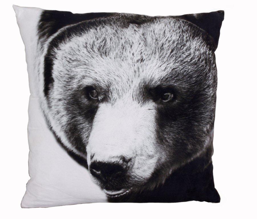 Kudde i svart/vit med motiv av en björn. Material av flanell och polyester.