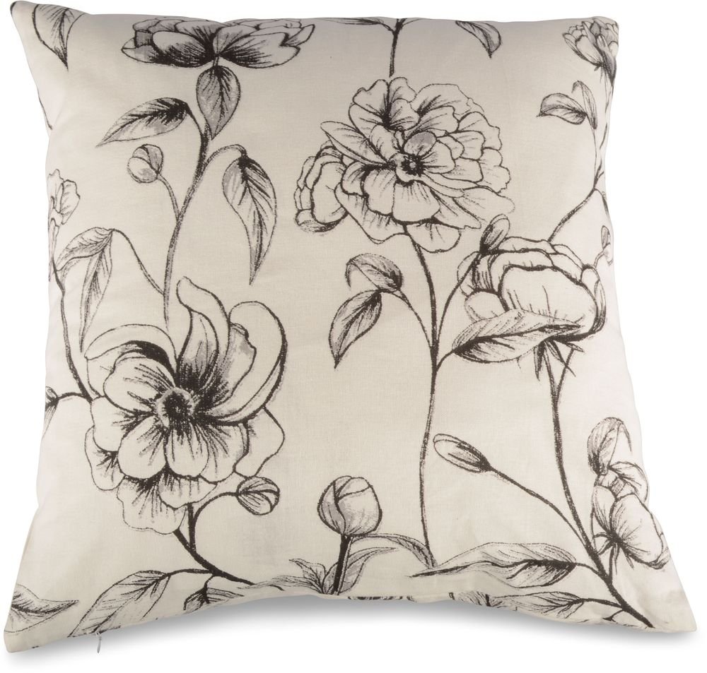 En mysig och snygg kudde i vit textil med mönster av blommor. Stoppad med bomull.