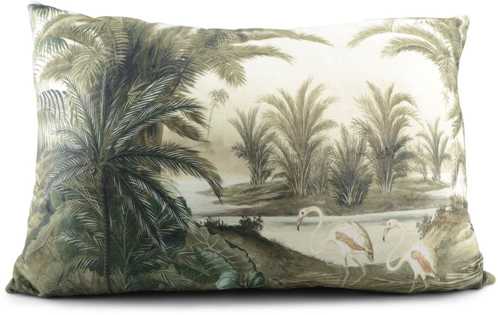 En snygg och mysig kudde i textil med fint motiv av svanar på en tropisk plats. Stoppad med bomull.