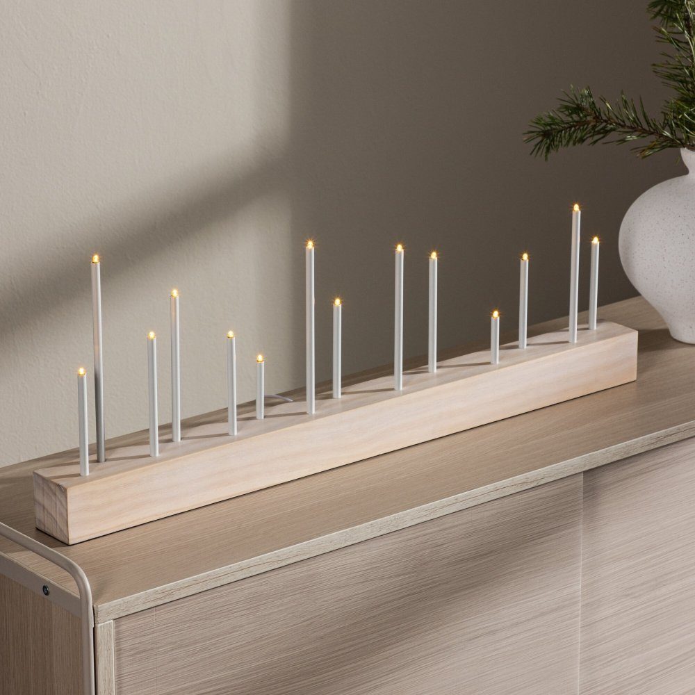 Ge ditt hem en touch av traditionell charm med denna vackra adventsljusstake som är tillverkad i vitvättad MDF och erbjuder en klassisk tolkning av den traditionella adventsdekorationen. Med hela 14 inkluderade lampor sprider den en varm och inbjudande glöd som skapar en stämning av förväntan inför julen. Den vitvättade MDF-designen ger en subtil och tidlös känsla till din inredning samtidigt som den skapar en lugnande atmosfär i ditt hem. Placera den på din matsalsbord, en hylla eller som en central del av din juldekoration för att lysa upp ditt hem under hela julperioden. Med adventsljusstaken kan du skapa minnesvärda stunder och njuta av jultraditioner med en klassisk touch. Låt den bli en viktig del av din jul och skapa varaktiga minnen för kommande år.