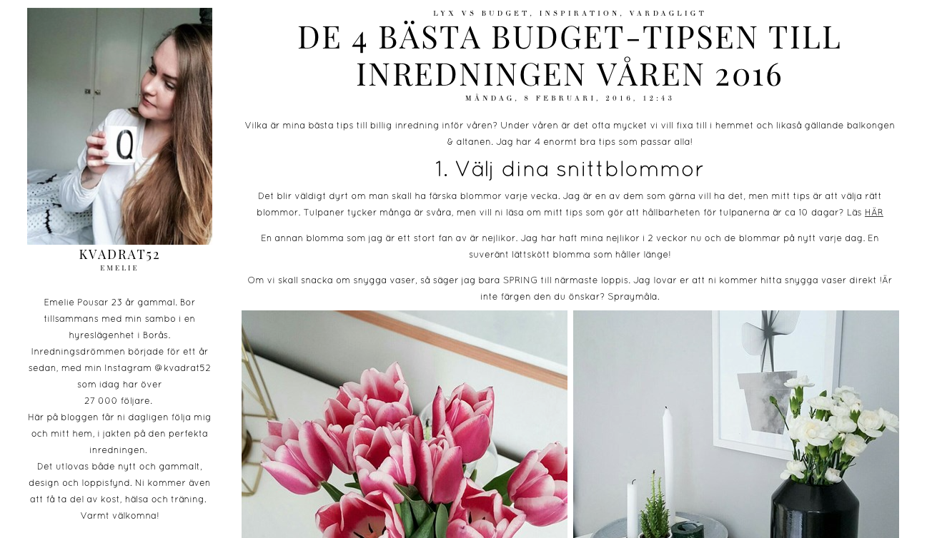 KVADRAT 52 är en blogg som startades för 1 år sedan av Emelie som bor i en hyreslägenhet med sin sambo. Emelie drömmer om den perfekta inredningen och man förstår att jakten på den är rolig. Stilen är modern vit, grå med inslag av guld och svart. Det finns bilder på lägenheten förstås och så inspirerande bilder från Emelies jaktmarker Pinterest och Insta. Man får inredningstips för små lägenheter, DIY av alla slag möbler och loppisfynd som målas om, fiffiga gå-bort-presenter en del av tipsen visas som video-tutorials. Lyx vs budget är alltid ett roligt inslag. Emelies andra intressen som det går att läsa om här är träning, hälsa och kost.