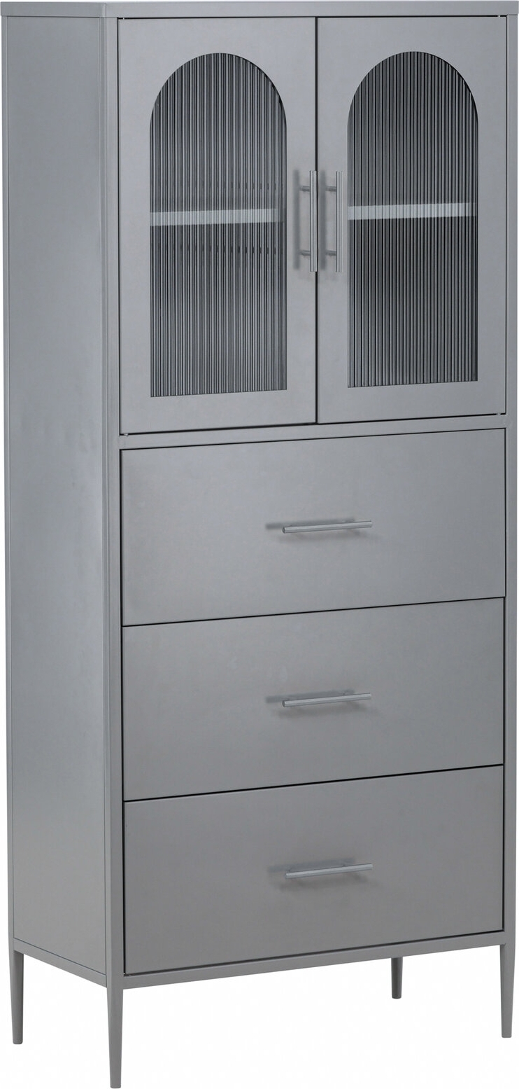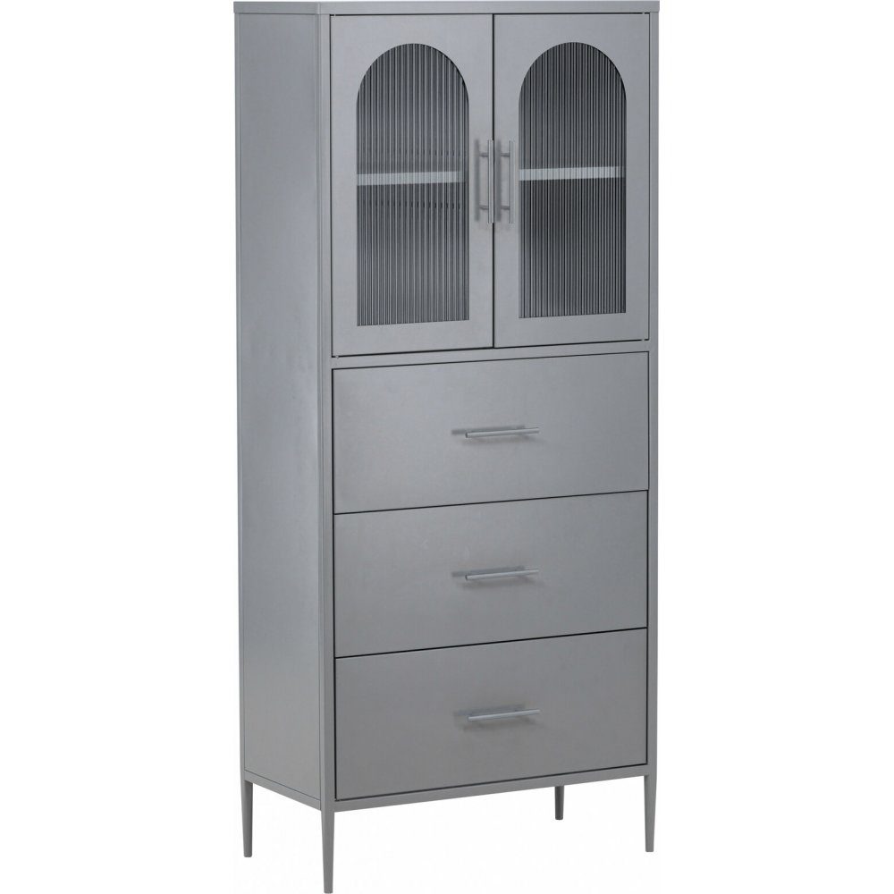 Välkommen till en pampig nivå av förvaring med vårt ståtliga förvaringsskåp i en vacker ljusgrå kulör - La Paz! Detta skåp är inte bara ett skåp, det kombinerar stilren elegans och funktionalitet på ett perfekt sätt och kommer troligen att förändra din uppfattning om förvaringslösningar. Det här ljusgråa skåpet är genomtänkt i minsta detalj. De mässingsfärgade handtagen ger en lyxig känsla till blickfånget. Deras subtila glans fångar din uppmärksamhet och ger helheten en magisk aura. Skåpet är tillverkat i pulverslackerad metall i en behaglig ljusgrå kulör som smälter sömlöst in i massor av olika inredningsstilar. Det bärs upp av fyra smala ben som inte bara ger ett luftigare intryck utan även underlättar för dammsugaren. I botten finns tre rymliga lådor och de är ditt hemliga vapen mot ett rörigt hem. Här kan du enkelt och smidigt gömma undan saker och hålla ditt utrymme prydligt och organiserat. Överst finns två skåpsluckor som ramas in av ett valv i veckat glas och som diskret synliggör lite av din vackra förvaring. Placera det fina porslinet eller de lyxiga glasen överst och låt de bli en del av din inredning!