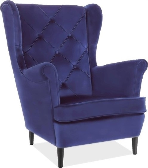 Fåtölj av bokträ. Klädd med polyestertyg i sammetsimitation.