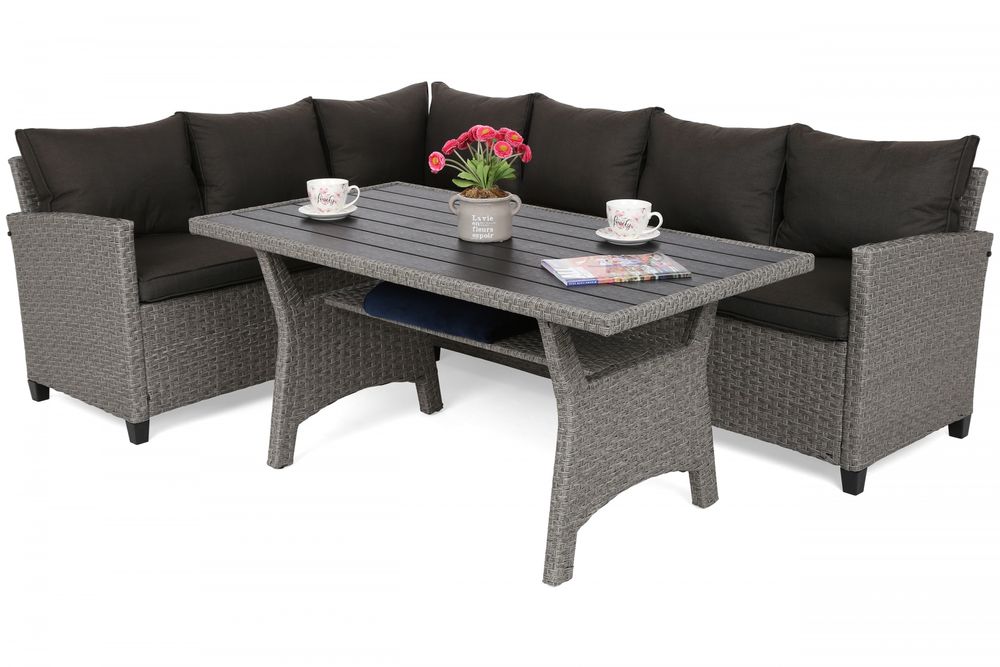 Hörnsoffa med bord, tillverkat i pulverlackerad aluminium och klätt i konstrotting. Bordet har en toppskiva i komposit. Till hörnsoffan ingår även sits- & ryggdynor i grå färg.