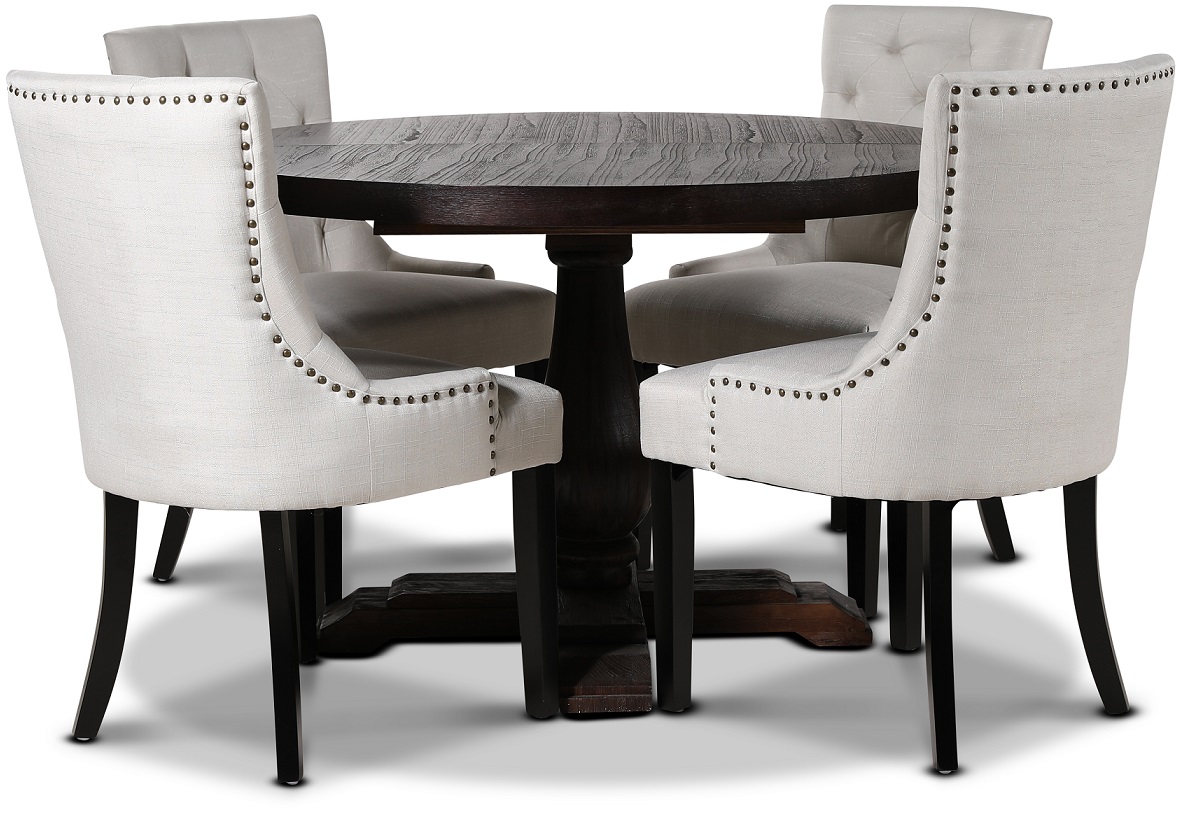 Medföljer gör också 4 st Tuva stolar i ett ljusbeige tyg med antikfärgade nitar som en fräck detalj. Stolen är välarbetad och en av våra mest populära matstolar till Vintage-stilen.