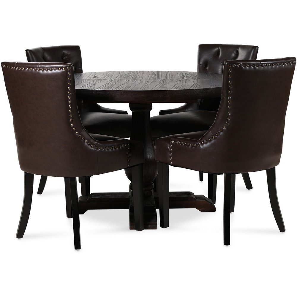 Medföljer gör också 4 st Tuva stolar i ett vintage brunt PU med antikfärgade nitar som en fräck detalj. Stolen är välarbetad och en av våra mest populära matstolar till Vintage-stilen.