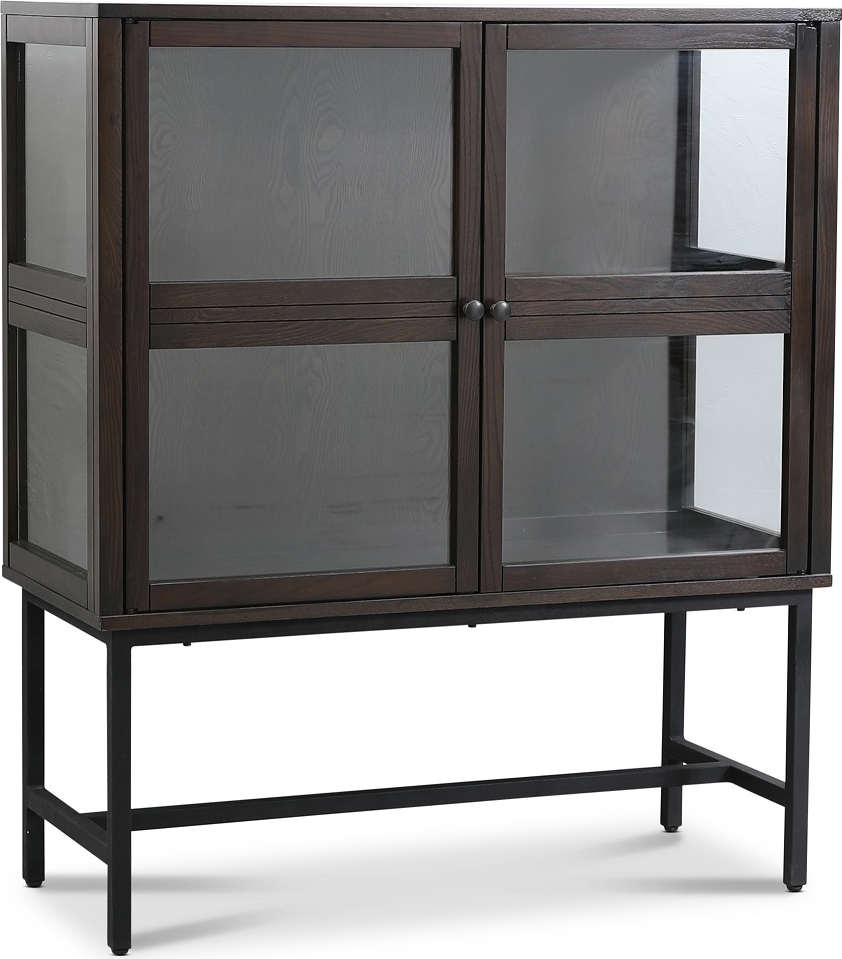 Ett klassiskt highboard i massivt trä och brunbetsad ekfanèr. Underrede i svart sandlackat metallunderrede. Inuti skåpet finns en glashylla i härdat glas. Helt färdig monterad från fabrik.