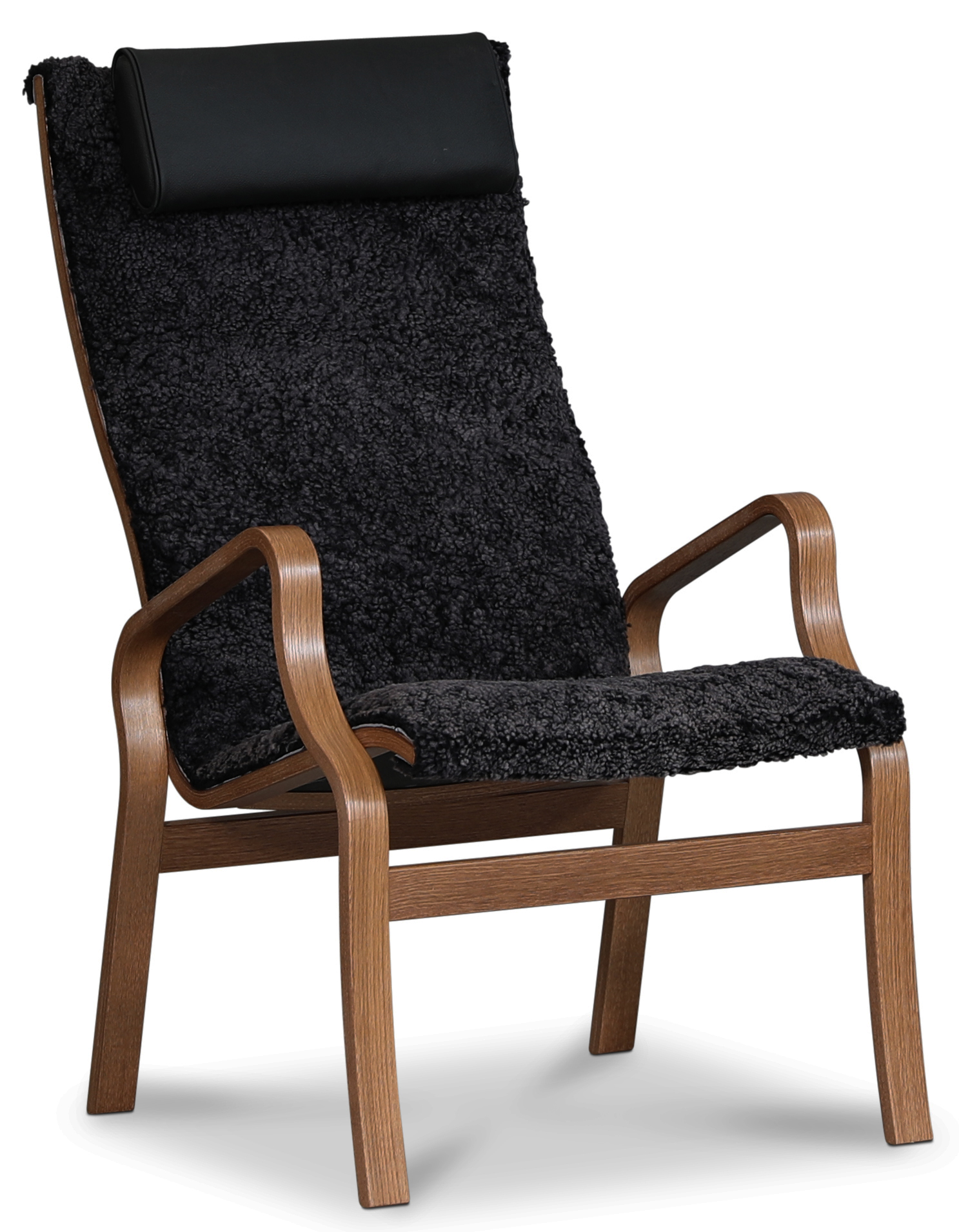 Lammet fåtölj är designad i Danmark av Nielsen design med känsla för det skandinaviska hemmet. Möbeln är klädd i mörkgrått äkta fårskinn med välarbetade armstöd i brunbetsad ek-fanèr. En designklassiker som håller för framtiden. Fåtöljen kan både användas med och utan nackkudden i äkta svart läder.