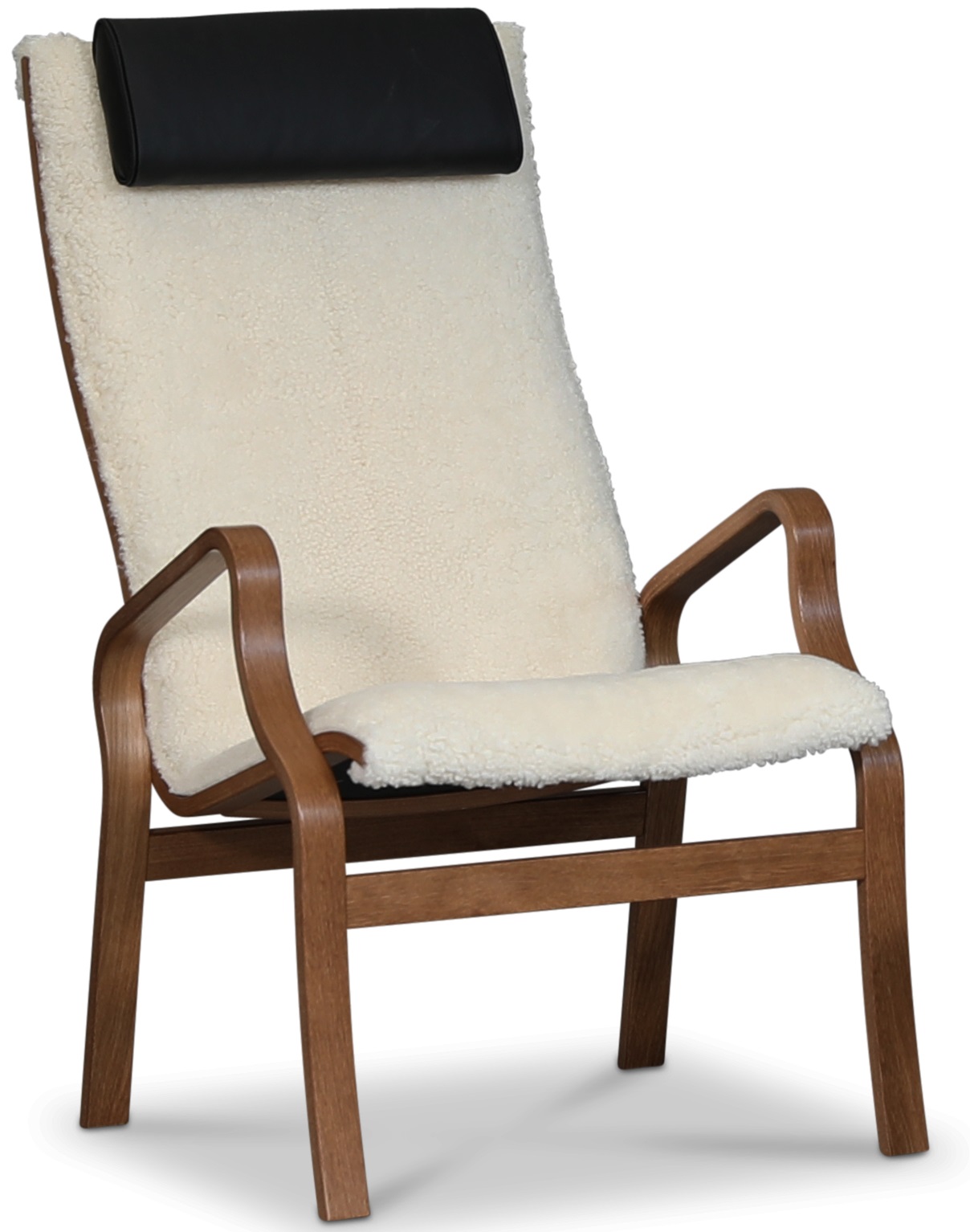 Lammet fåtölj är designad i Danmark av Nielsen design med känsla för det skandinaviska hemmet. Möbeln är klädd i ljustäkta fårskinn med välarbetade armstöd i brunbetsad ek-fanèr. En designklassiker som håller för framtiden. Fåtöljen kan både användas med och utan nackkudden i äkta svart läder.