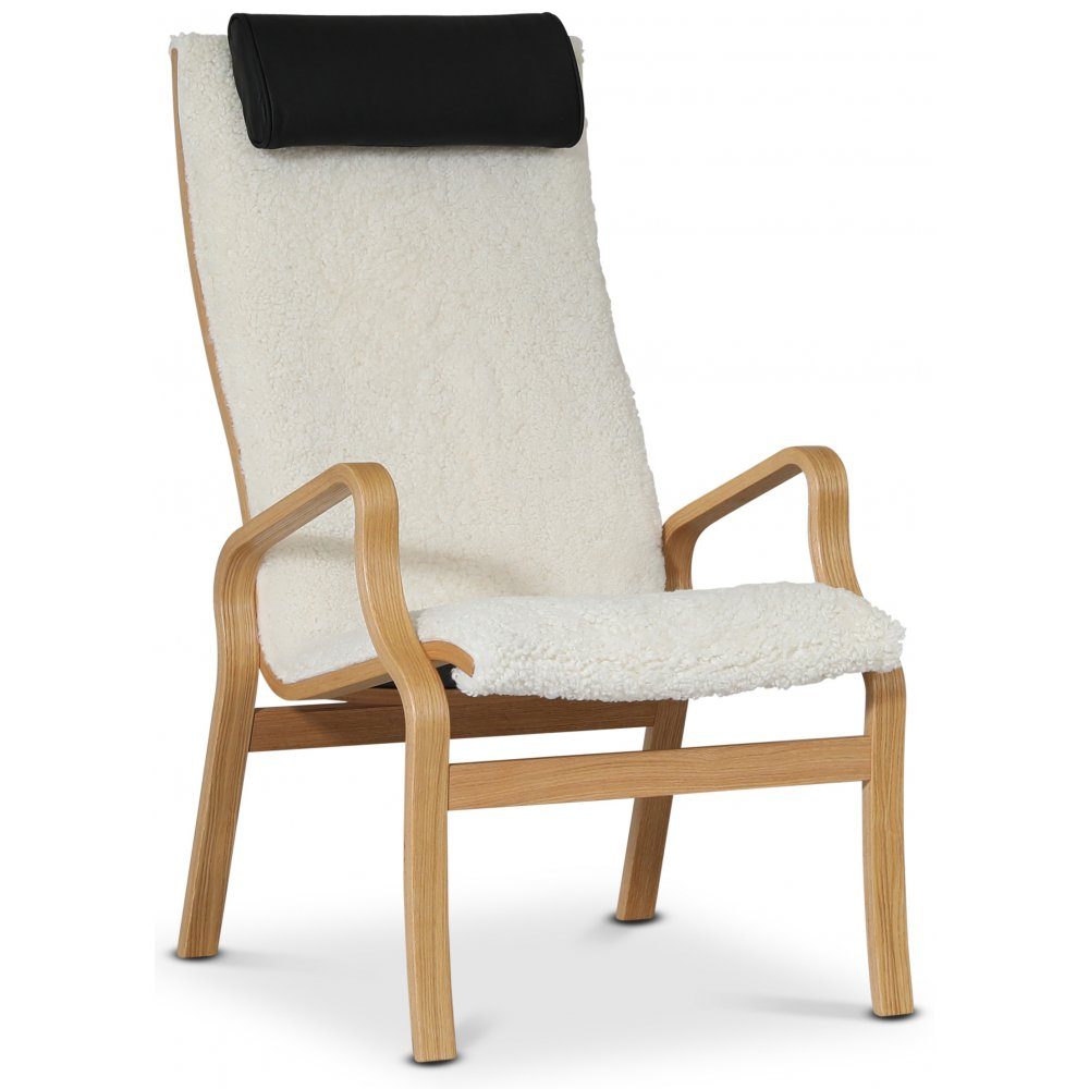 Lammet fåtölj är designad i Danmark av Nielsen design med känsla för det skandinaviska hemmet. Möbeln är klädd i ljustäkta fårskinn med välarbetade armstöd i oljad ek-fanèr. En designklassiker som håller för framtiden. Fåtöljen kan både användas med och utan nackkudden i äkta svart läder.