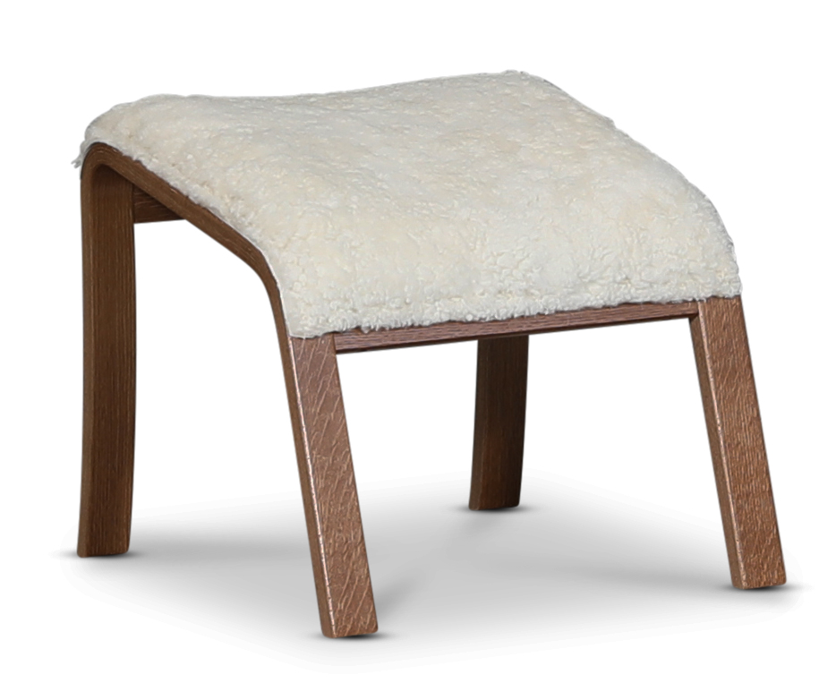Lammet fotpall är designad i Danmark av Nielsen design med känsla för det skandinaviska hemmet. Möbeln är klädd i ljust äkta fårskinn med välarbetade ben i brunbetsad ek-fanèr.
