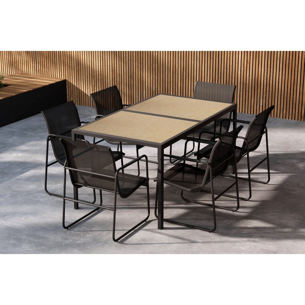 Lampedusa är en elegant matgrupp för utomhusbruk som kombinerar hållbarhet och modern design. Med sitt robusta bord i stål och en lättskött plastskiva, tål det väder och vind och passar perfekt för utomhusbruk. De sex stolarna, med en stadig stålram och bekväm textilene-sits, erbjuder både komfort och hållbarhet. Den trendiga svart/bruna färgkombinationen ger ett tidlöst uttryck till din uteplats och skapar en inbjudande och funktionell matplats. Perfekt för sommarkvällar och härliga middagar med familj och vänner.