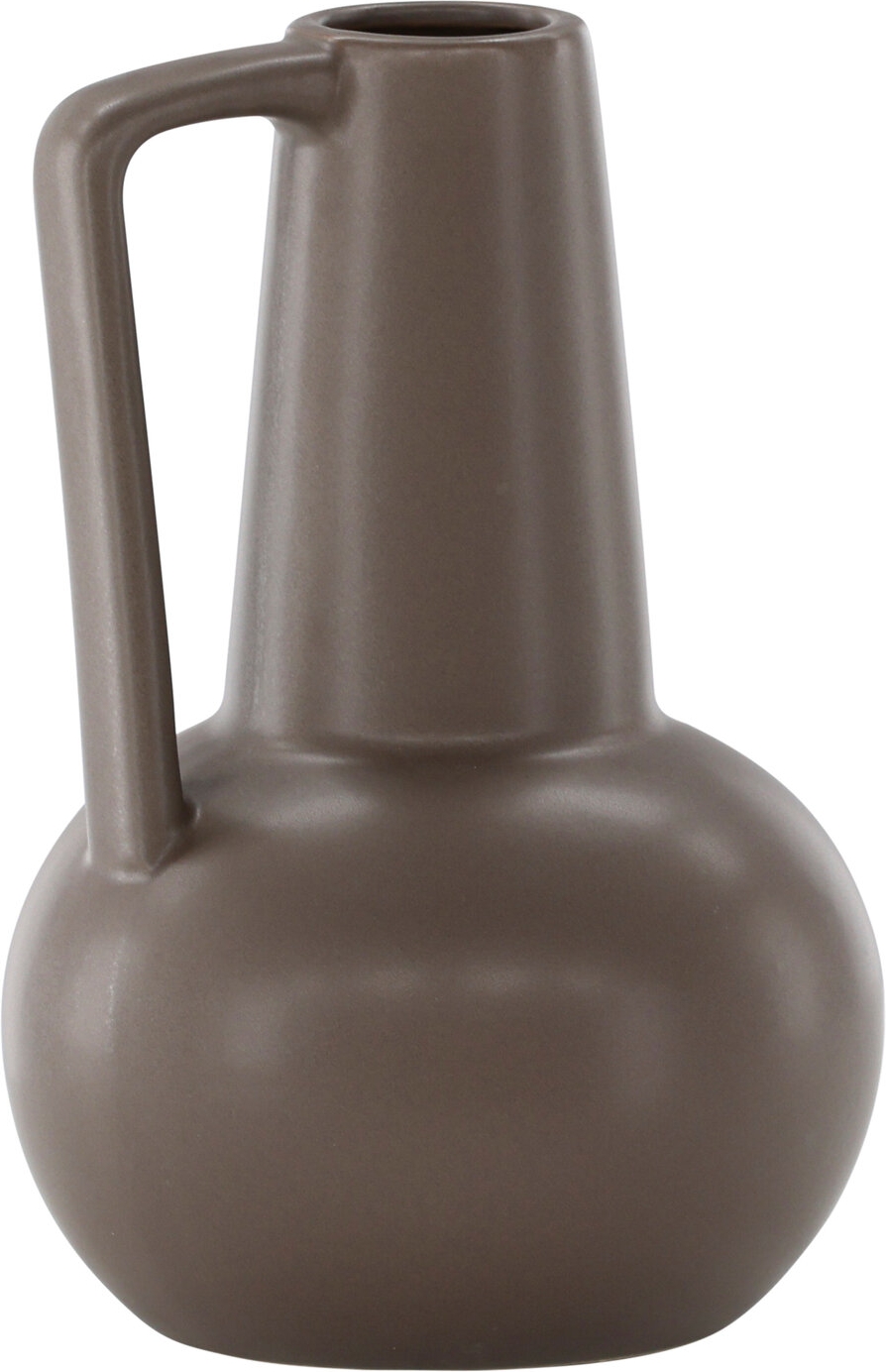 Lane är en elegant vas i en mjuk mattbrun nyans, tillverkad av stengods. Med sina imponerande 22 centimeters höjd är den ett iögonfallande tillskott till vilket rum som helst. Vasens design är enkel och snygg med en rundad form som liknar en cylinder. Den distinkta handtaget på sidan ger inte bara ett praktiskt element utan bidrar även till att höja vasens visuella attraktion. Den matta ytan ger ett sobert och modernt intryck, vilket gör Lane till en mångsidig inredningsdetalj som passar lika bra i det minimalistiska hemmet som i det mer traditionella. Vasens konstruktion i stengods ger den både stadighet och en naturlig känsla. Den är inte bara ett konstverk i sig själv utan också en idealisk plats att visa upp dina favoritblommor eller gröna växter. Lane är ett uttryck för stil och enkelhet, och dess närvaro i ditt hem kommer säkerligen att skapa en harmonisk atmosfär och ge en touch av sofistikering till ditt inredningsarrangemang.