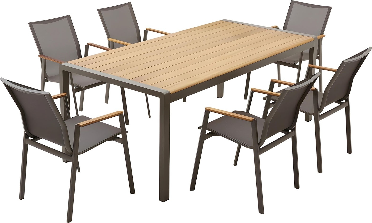 Utematgrupp av irokoträ och aluminium med bord och 6 stolar.