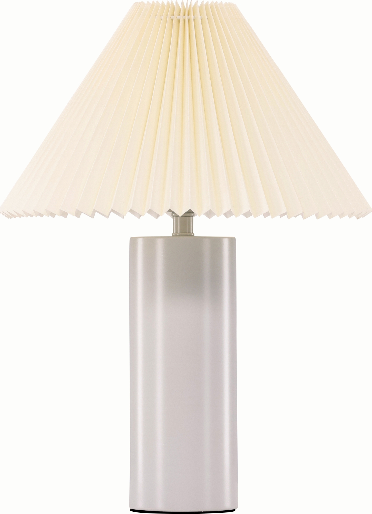 Stilren och modern lampa som passar perfekt på sängbordet eller sidobordet. Den trendiga lampskärmen i grått tyg och veckat mönster i kombination med den cylinderformade lampfoten i grått järn gör den här lampan både tidlös och elegant. Med denna bordslampa får du ett mysigt och behagligt ljus och en trendig inredningsdetalj som står sig över tid.