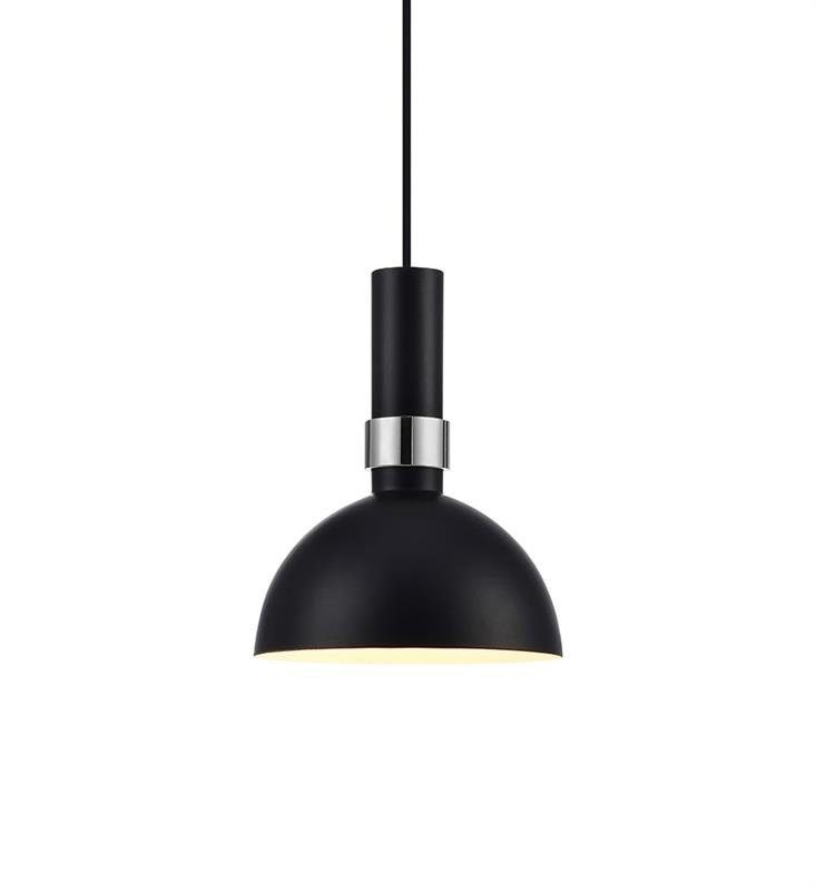 Larry härliga taklampa med en stilren design. Tillverkad i svart metall med detaljer i krom. 1,5 meter svart textilsladd. Fast installation med bygelupphäng. Stor lamphållare (E27). Max 60W glödlampa eller motsvarande styrka i halogen, lågenergi eller LED. Lampan passar perfekt in på flera platser i hushållet.