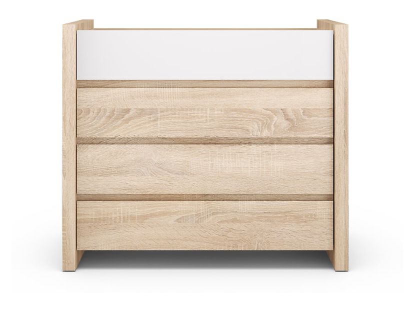 Nätt byrå med rymlig förvaring bakom de fyra lådorna, dessa har mjuk stängande funktion. Byrån är i ek-imitation med översta lådan i vit högglans. Kombinera gärna med andra möbler i samma serie.