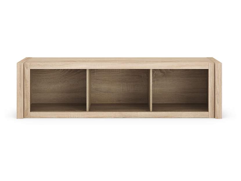 Ett praktiskt väggskåp i ek med tre fack. De förtjockade sidorna blir en snygg detalj. Skåpet kan med fördel hängas ovanför mediebänken eller sideboardet i samma möbelserie.