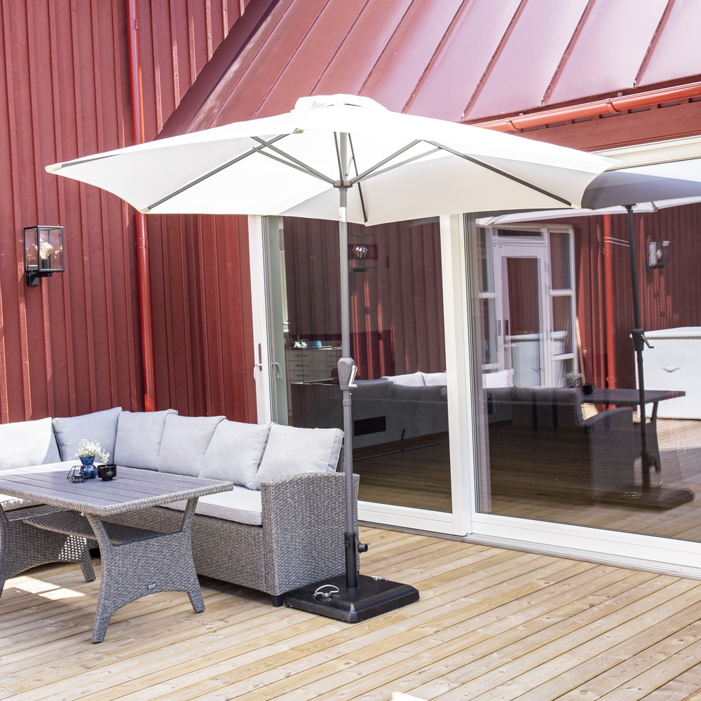 Leeds är ett stilrent och modernt parasoll som skyddar dig mot solens starka strålar! Parasollets tak är tillverkad i polyster och har en stomme i aluminium. Den vita kulören skapar ett lyxigt och tidlöst uttryck på uteplatsen. Parasollet fälls enkelt ut med hjälp av vevlyft och finns också i grått och svart.