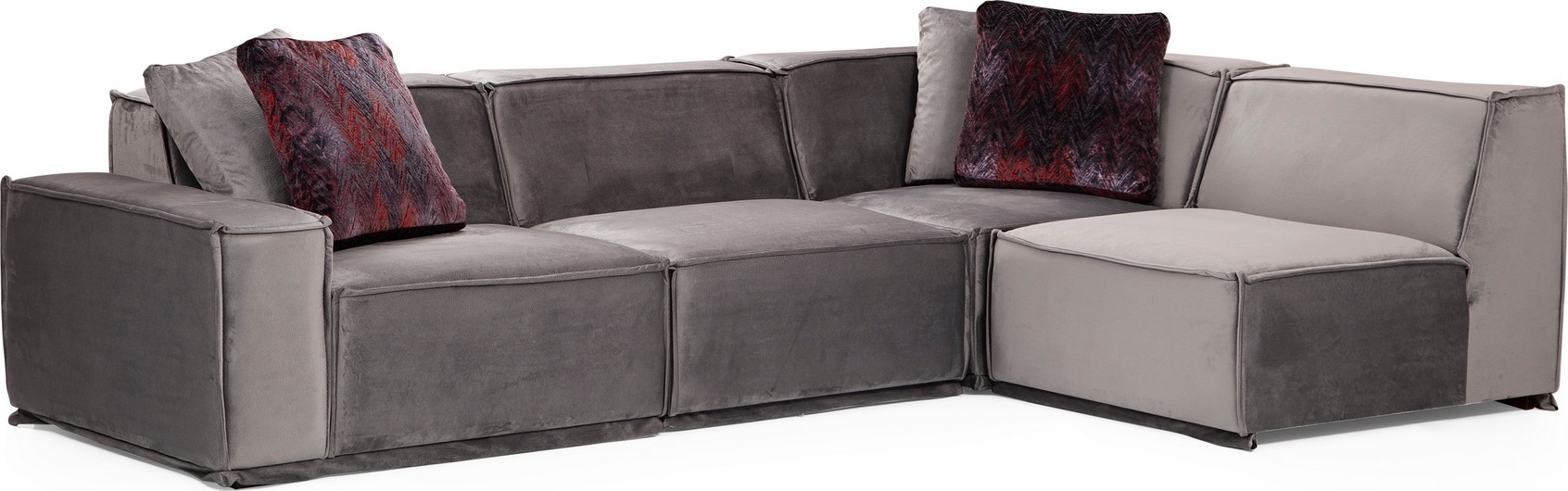 Hörnsoffa av bokträ och spånskiva. Klädsel av polyester. Fasta sitt- och ryggdynor.