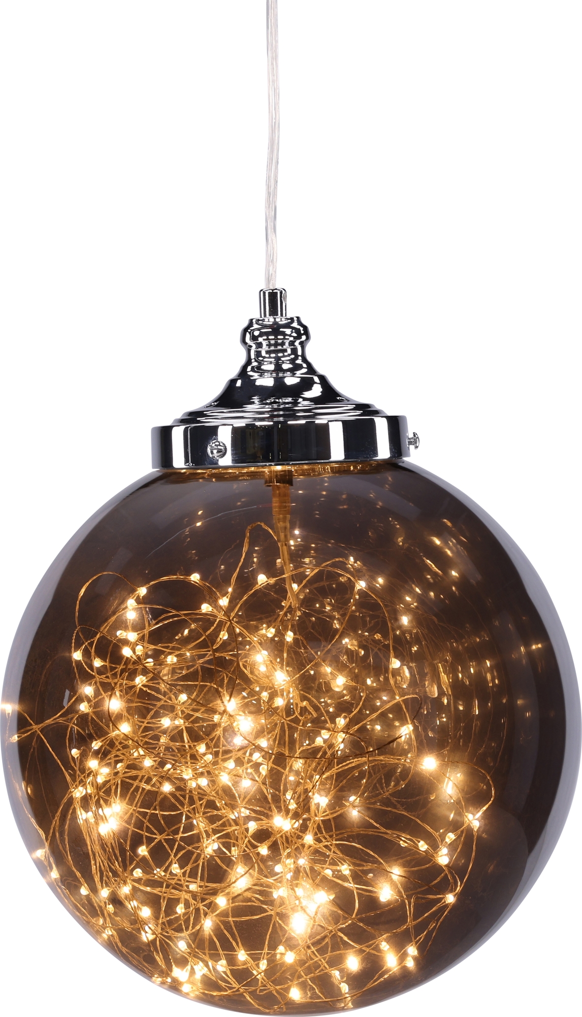 Taklampa som imponerar med sin unika ljuskälla och vackra utformning. Lampan består utav ett enkelt grått fäste i järn och en vacker kupa i rökfärgat glas som låter ljuskällan, som består utav en led ljusslinga, lysa igenom. Med den här lampan skapar du en mysig och hemtrevlig känsla och passar perfekt som fönsterlampa. Den nätta storleken ger möjligheten att kombinera flera lampor i olika höjd för ett lyxigare intryck.