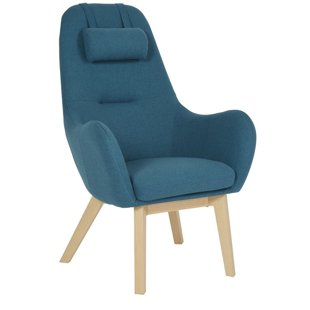 Fåtöljen Leo i petrolium blått tyg, skön nackkudde och benstativ i vitoljad ek! En snygg modern skandinavisk design!