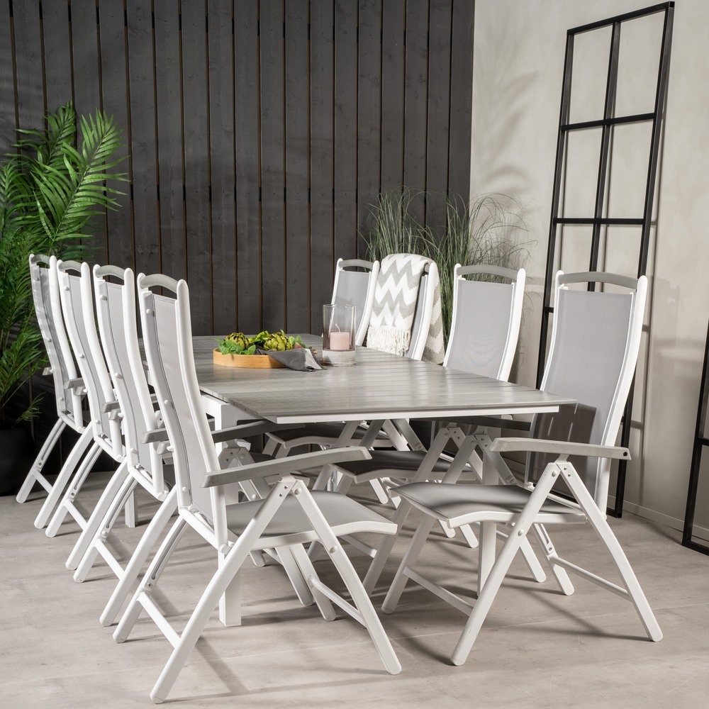 Levels - Ett rektangulärt matbord som går att förlänga vid behov när det behövs fler sittplatser: här får alla nära och kära plats! Bordsskivan är i grå aintwood och bordsbenen i metall: två slitstarka material som ger dig ett tåligt matbord för utomhusbruk. Möblera tillsammans med ett par bekväma matstolar så får du en komplett matgrupp till sommarens utomhusmåltider. Skötselråd: Materialet är framtaget för att användas utomhus då det är väderbeständigt och står emot både fukt och mögel. Aintwood är därför ett optimalt material för utomhusmöbler. Undvik skador på bordet genom att använda underlägg och låta bli att placera varma föremål direkt på ytan.