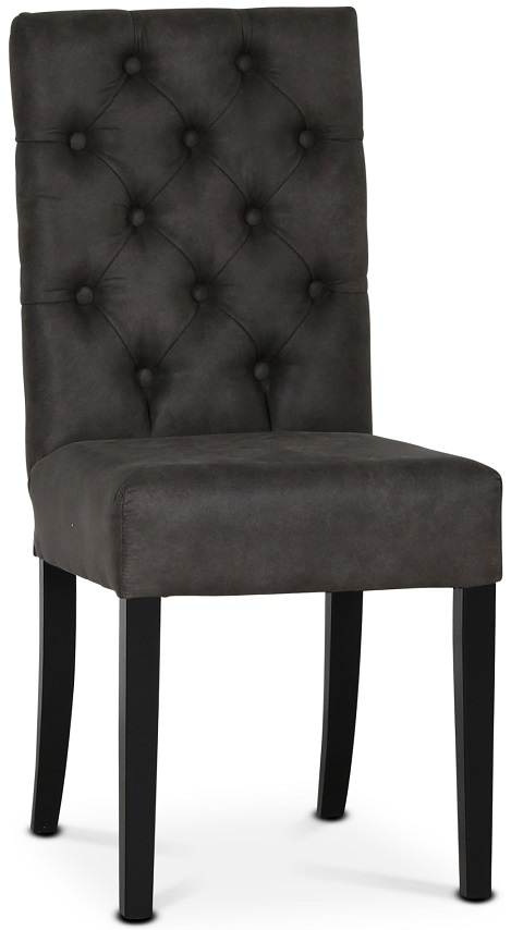 Matstol från Skånska Möbelhuset i massiv svarta träben, Sits och rygg klädd i ett mörkgrå artificiell läder. Ryggen är med djuphaftade knappar för att ge en exklusiv känlsa och utseende.