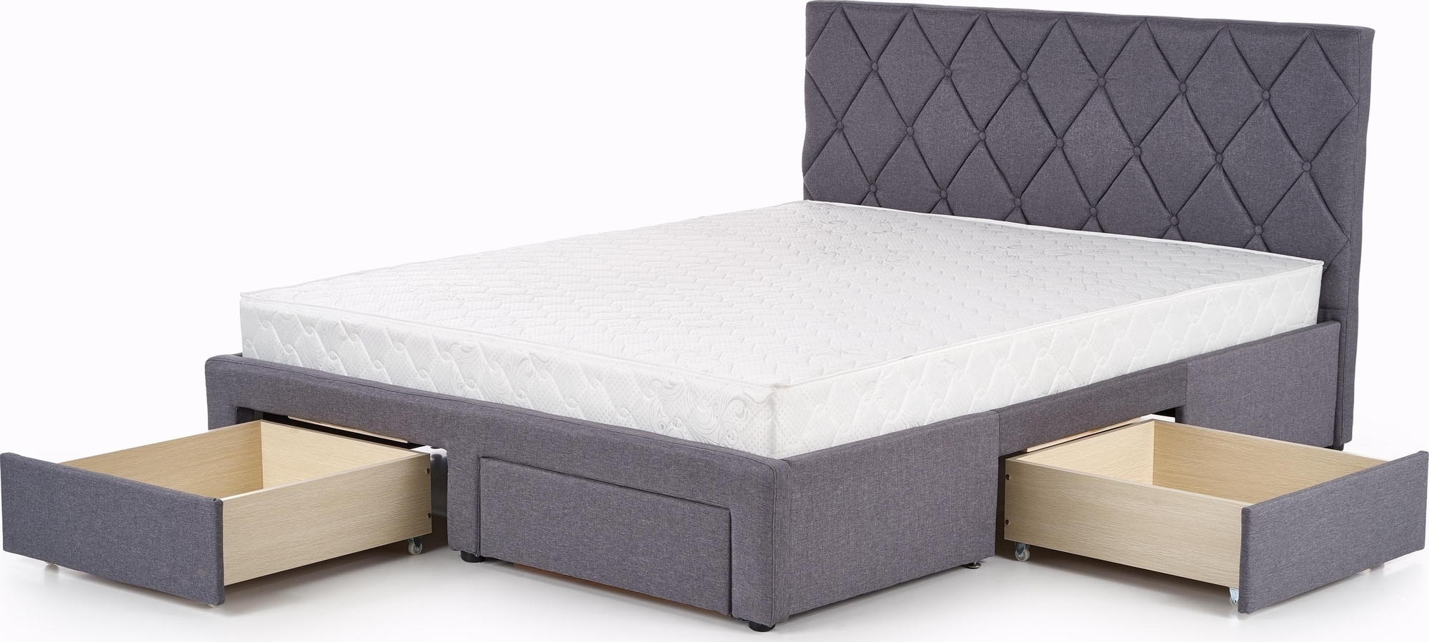 En mysig säng med en stilren design. Sängen är tillverkad av solid trä och klädd med ett mycket behagligt tyg och med praktiska förvaringslådor i ramen för smart förvaring av exempelvis kläder, och benen har ett svart utförande. Sängen är gjord för madrassmåt 160x200cm.