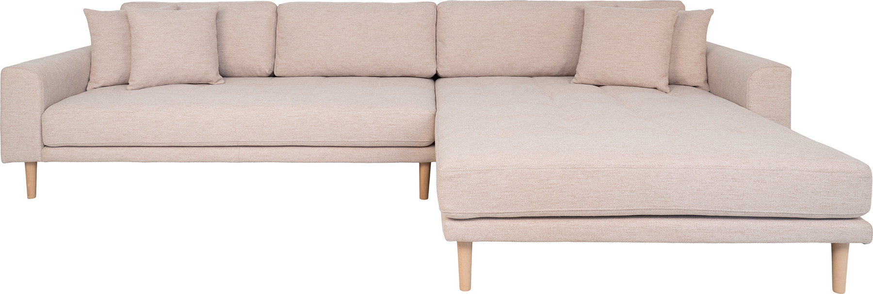 Högervänd divansoffa av bokträ med klädsel av polyester. Levereras omonterad.