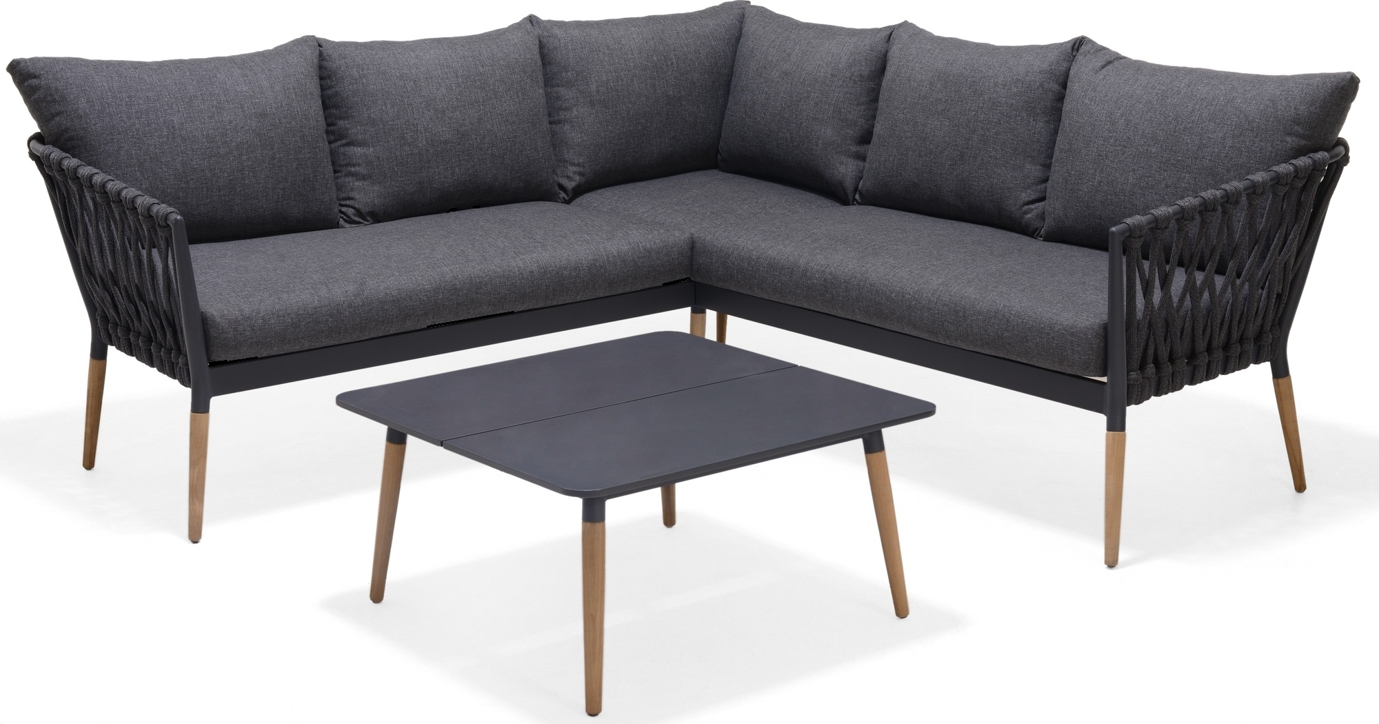 Loungegrupp med 1 st hörnsoffa och 1 st soffbord. Tillverkat av aluminium med klädsel och rep av olefin.