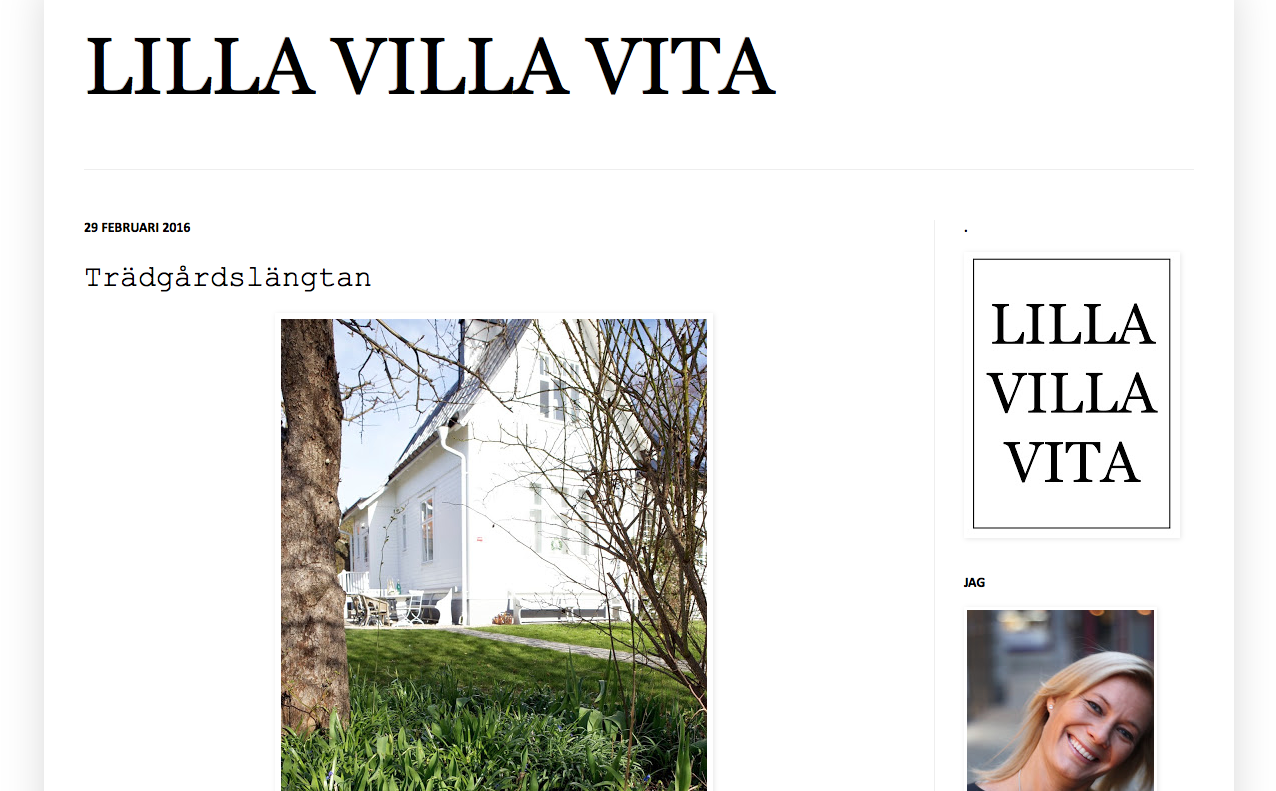 Plötsligt 2008 händer det något med det lilla vita huset som är så charmigt men tomt och lite ensamt efter att ha sovit sin törnrosasömn i en vacker och vildvuxen trädgård med rosor som växer nästan som de vill. Rosorna tuktas och bersån klipps ned - vad är på gång? Hur skall detta sluta? Men så småningom kommer en fin trädgård fram med ny berså! Hösten 2009 smyger bloggen LILLA VILLA VITA igång och nu kan vi alla följa hur fint och varsamt renoveringen sker. Men det här är ingen före och efter blogg utan en blogg fylld med vackra bilder på hemmet och huset som nu ligger där som en liten vit pärla. Det byggs också ett lusthus som är så fint att det måste man helt enkelt gå in och titta på själv på bloggen. Maria utför också olika typer av stylinguppdrag och delar generöst med sig av bilder.