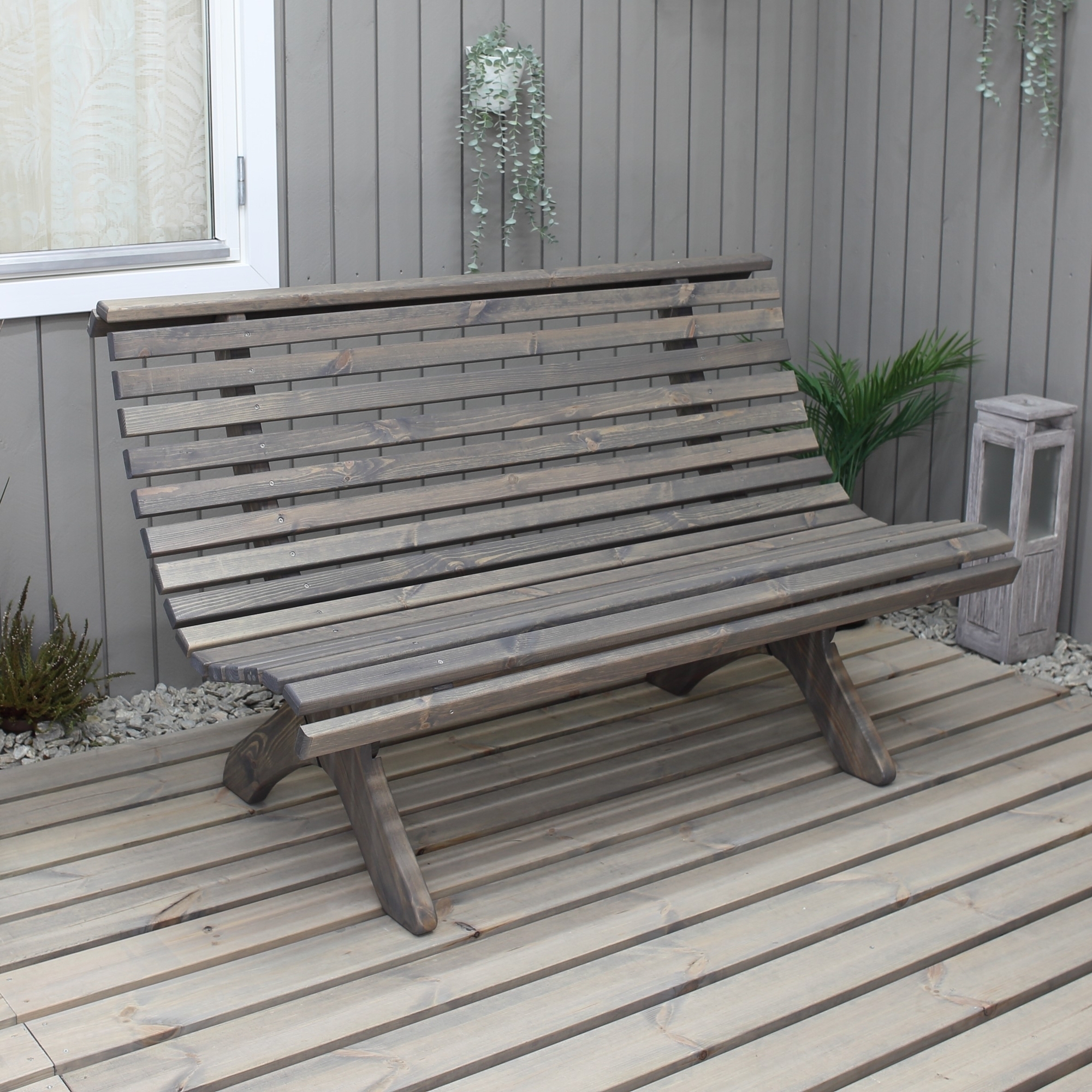 En klassisk grålaserad parkbänk tillverkad av furu att ha på uteplatsen för att skapa en parkkänsla i trädgården. Bänken är formgiven efter klassiskt skandinavisk möbeltradition.