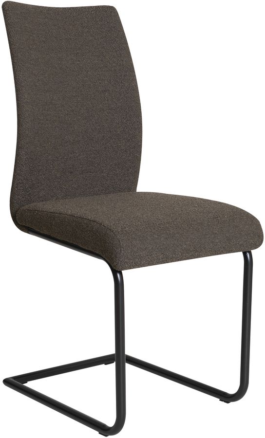Lina matstol klädd i ett mörkbrunt boucletyg med svarta metallben.