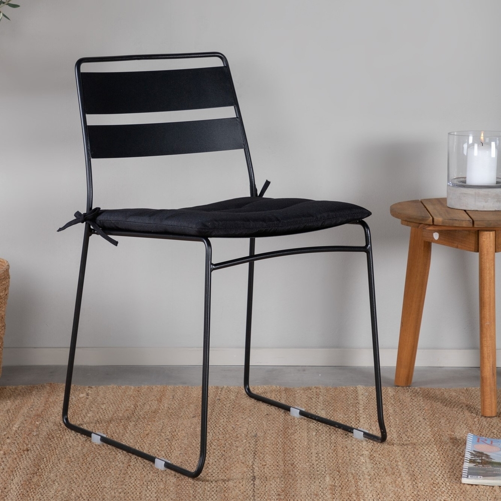 Lina är en stilren och enkel stol i svart stål som passar utmärkt i både uterummet som på altanen. Den smala designen gör stolarna lättanpassade och enkla att möblera. Matcha med ett läckert matbord och njut av måltider utomhus i sommar! Dyna finns att köpa till. Stolen är stapelbar. Skötselråd: Stål är ett material som är avvisande mot smuts och vätskor. Däremot behöver man vara uppmärksam på att vatten ska orsaka fläckar och rost. Se därför till att torka av ytan med en en mjuk fuktad trasa och såpvatten, för att undvika att materialet rostar.