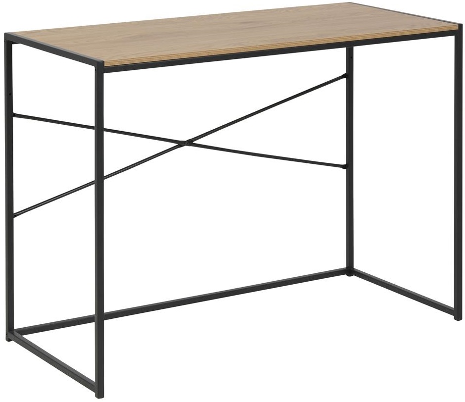 Ett mysigt skrivbord med en stilren design. Underredet är tillverkat i pulverlackerad svart metall och bordsskivan är av trä med en härlig vild-ekimitation. Skrivbordet passar perfekt in i flera olika miljöer och är lätt att kombinera med en skön kontorsstol.