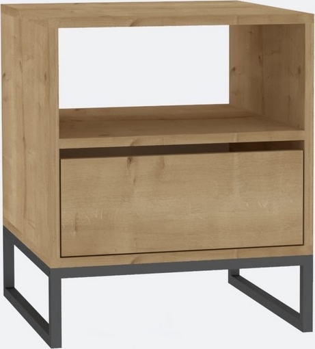 Sängbord av melaminbelagd spånskiva.