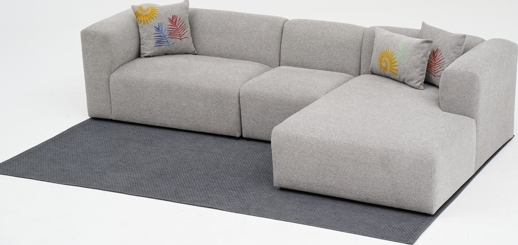 Soffa av bokträ med klädsel av chenilletyg och ben av plast.