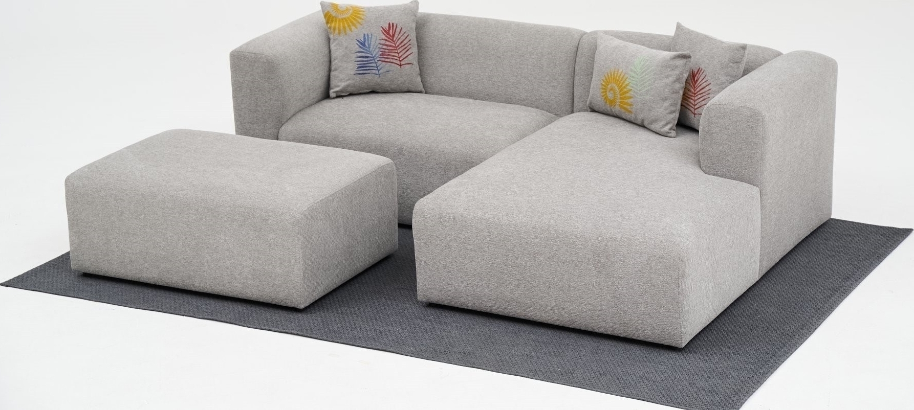 Soffa av bokträ med klädsel av chenilletyg och ben av plast.