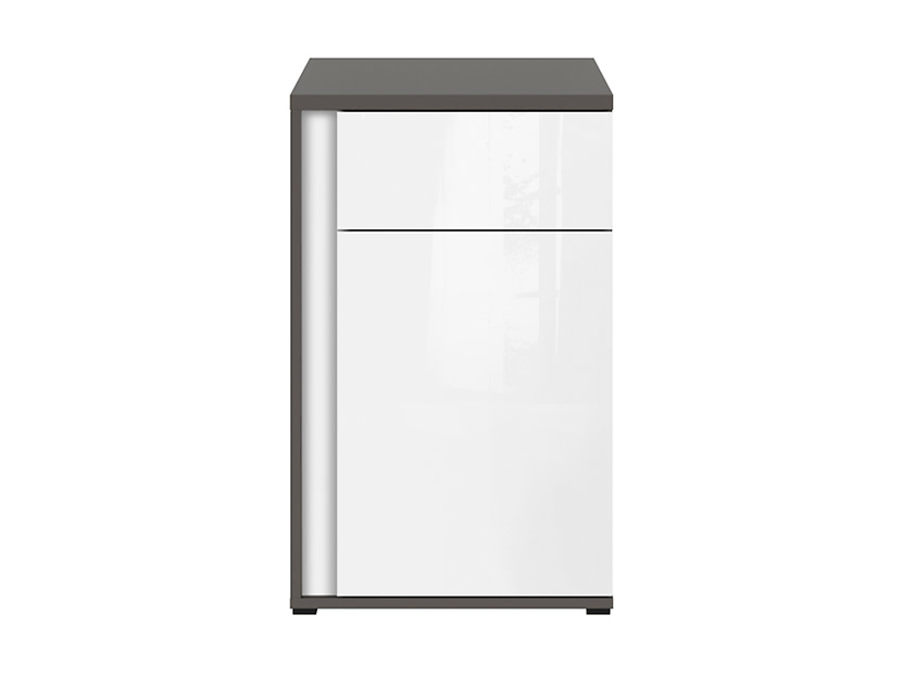 En liten byrå i grafitgrått med vita fronter. Med en låda och ett mindre skåp kan man förvara både mindre och större föremål. En dekorativ remsa på vänster sida i grått blir en fin detalj och är den röda tråden genom hela möbelserien.