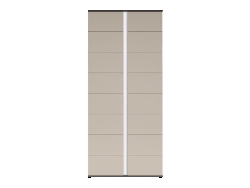 En fin garderob i grafitgrått med ljusgråa dörrar. Garderoben är inredd med en klädstång och många funktionella hyllplan. Den dekorativa remsan på mitten blir en fin detalj och är den röda tråden genom hela möbelserien