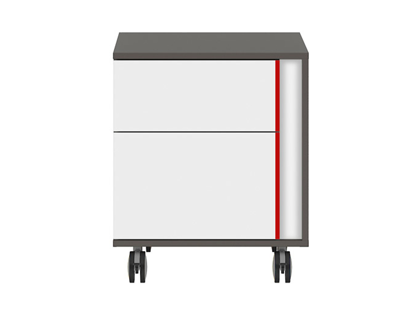 En praktisk lådhurts i grafitgrått med två lådor och fronter i vitt. Eftersom lådhurtsen har hjul kan man på ett enkelt sätt förflytta den efter behov. En dekorativ remsa på höger sida blir en fin detalj och är den röda tråden genom hela möbelserien.